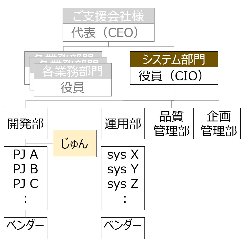 自社では開発を行わないが、業務部門から出てきた要件を自社のシステム開発部門で整理し、システム構築はシステムベンダーが行う流れとなっていた。また、一部のシステムは内製で構築していたため、自社でシステム開発業務もおこなう