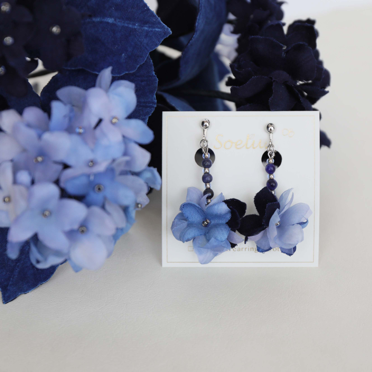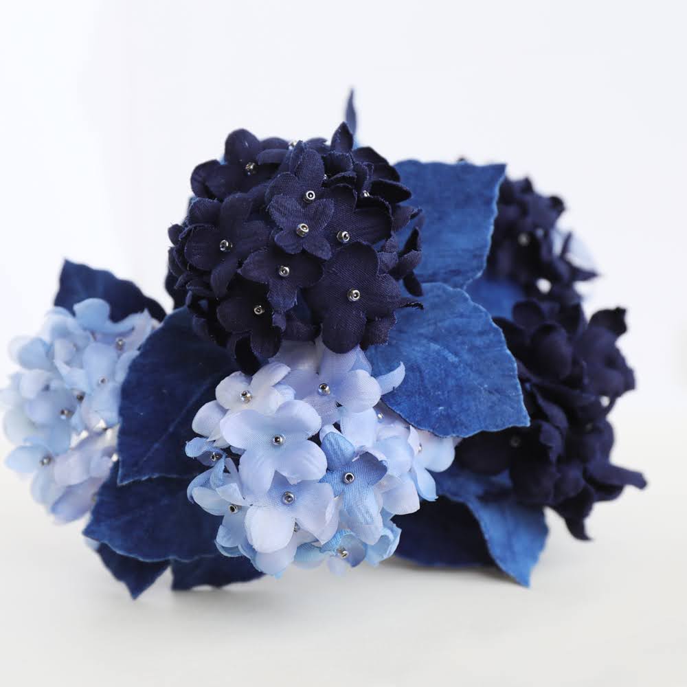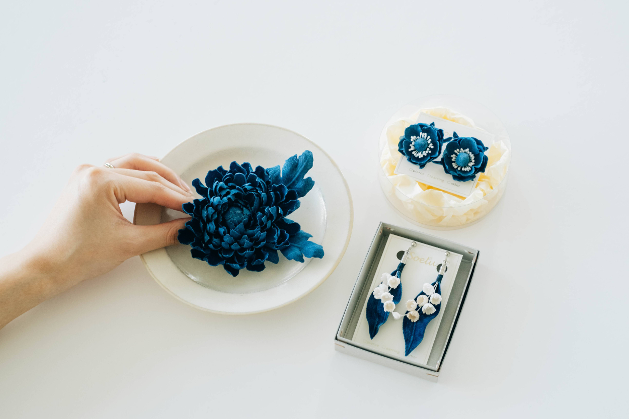 奄美藍染の濃い藍色の美しさを際立たせるすずらん・アネモネ・菊の3種類のアクセサリーを制作しました。