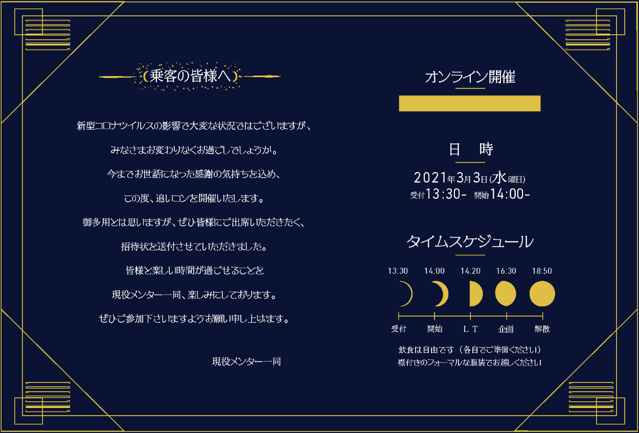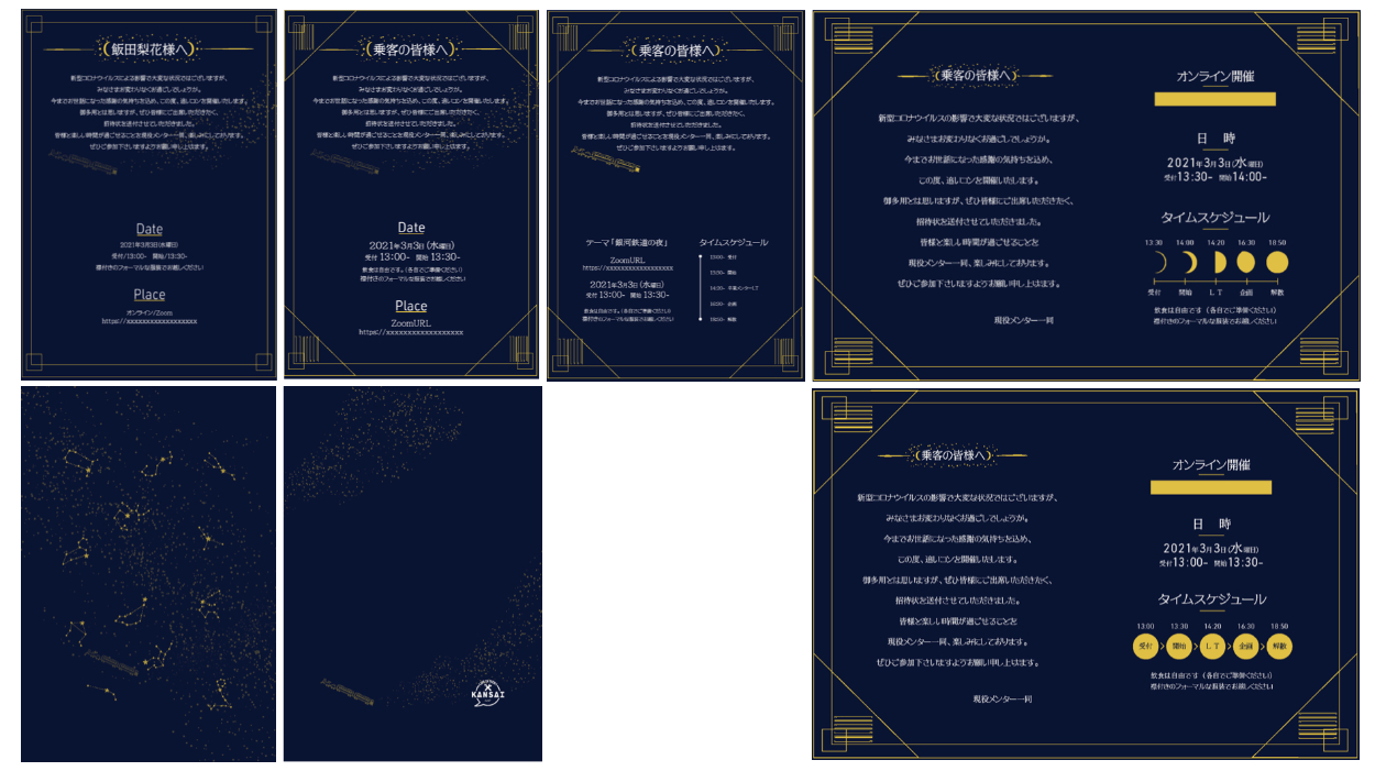 銀河鉄道をモチーフにしたイベントのデザイン(招待状) ジェシー フリーター OVERVIEW 2021年、インターン先の追い込んで銀河鉄道をモチーフにしたイベントの招待状・バーチャル背景・Webのデザインに携わりました。その中の招待状についての紹介です YEAR 2021 ◯最終採用案