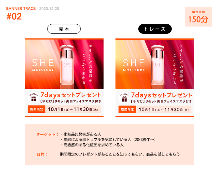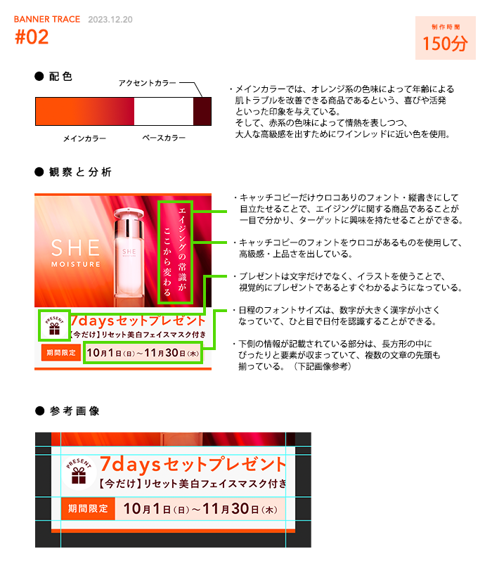 SHElikes MULTI CREATOR COURSEにて、バナートレース課題に取り組みました。ターゲットや目的、配色や設計についての分析も合わせてまとめました。
