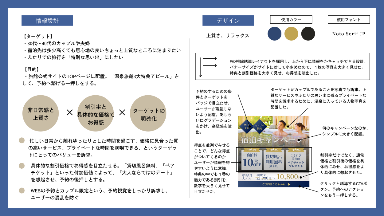 旅館サイトで掲載する架空のキャンペーンバナーを制作しました。3つの特典でお得感を出しつつ、旅先で特別な体験を得られる上質さを意識して制作しました。