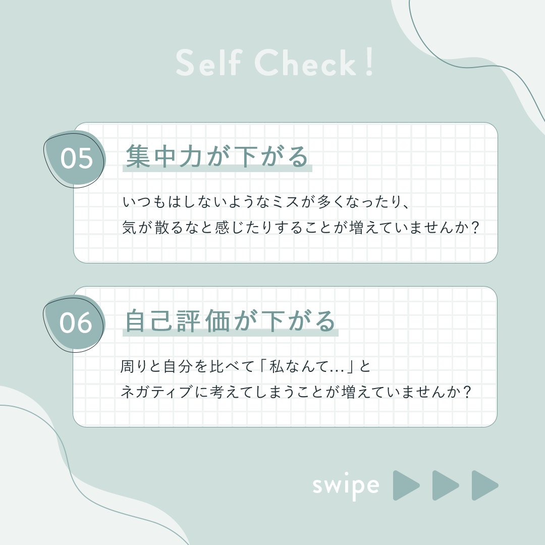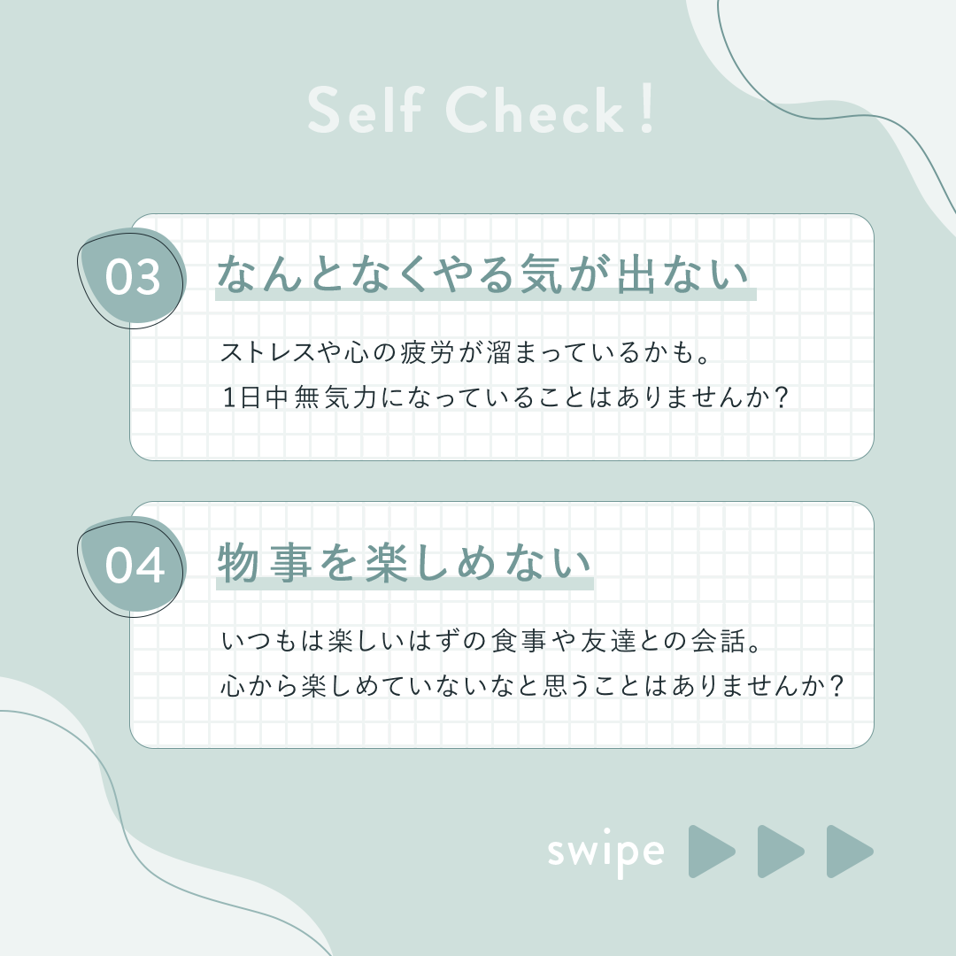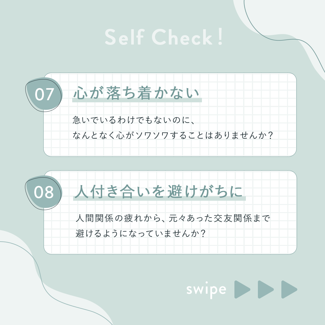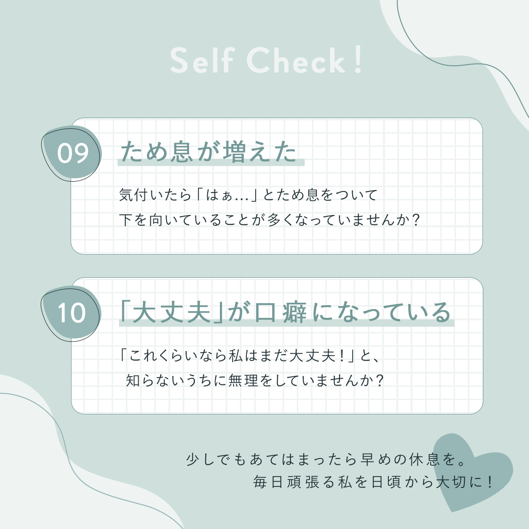 SHElikes内のSNSクリエイティブコンペ応募作品です。 「頑張りすぎてない?心が疲れている10のサイン」をテーマに、SHElikes公式Instagramに投稿されることを想定して制作しました。(情報設計からデザインまで)