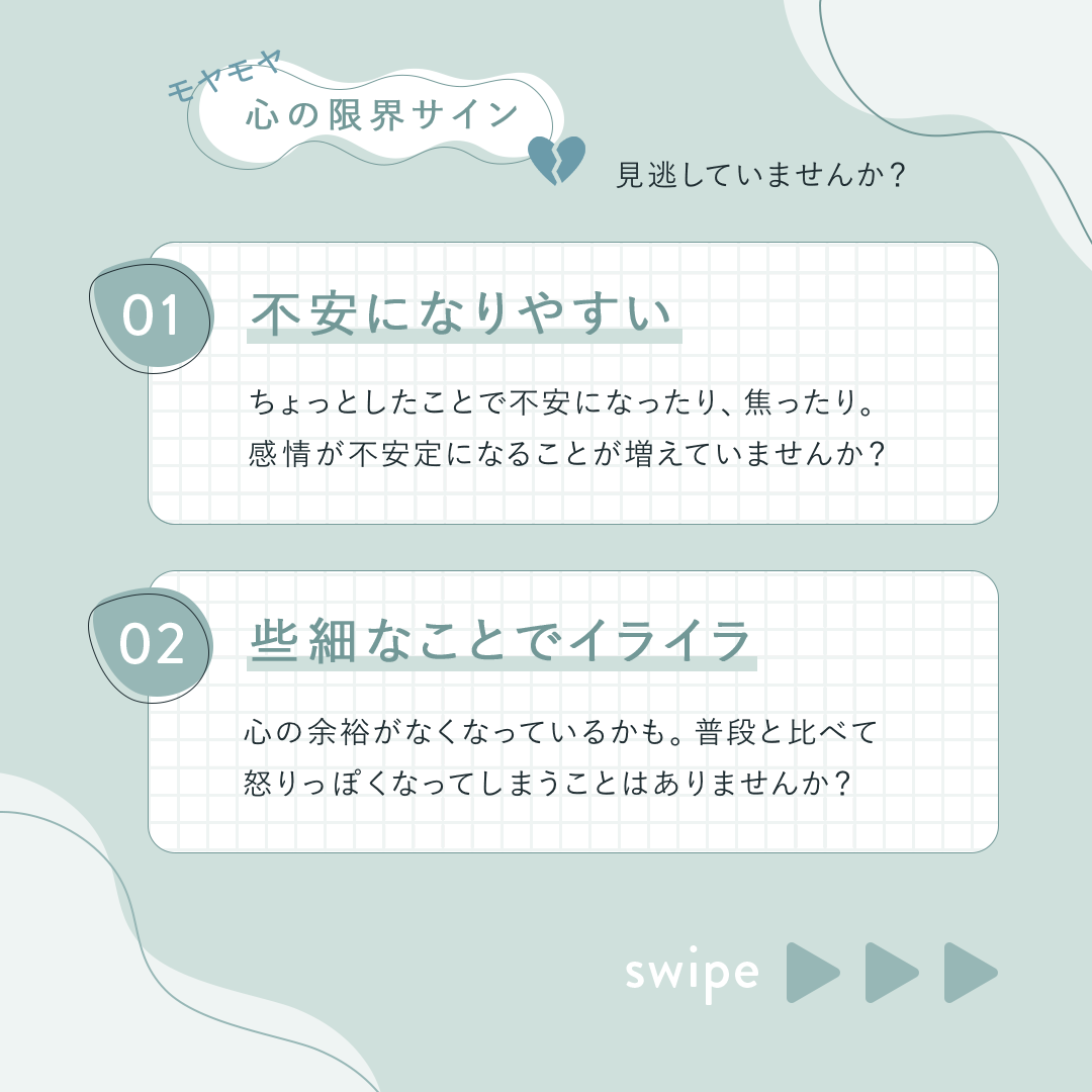 心の限界サインに気づけていないことをモヤモヤで表し、液体シェイプのあしらいを使って表現しました。ナンバリング、投稿全体としてのあしらいとしても使用し統一感を出しました。