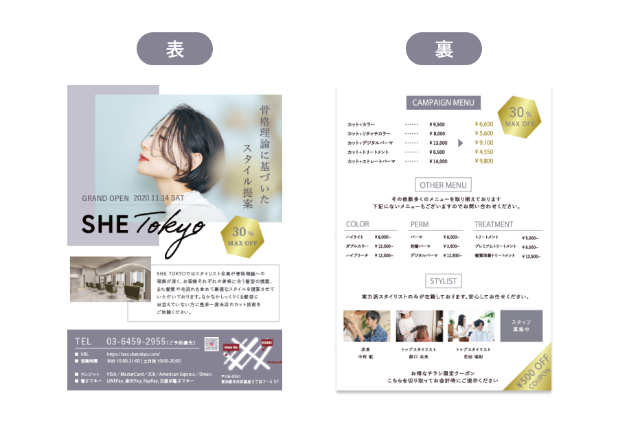 ・今回のフライヤーは予約をして美容院に来てもらうことがゴールであるため、下部の情報は予約するための電話番号のフォントサイズを大きくして、メリハリをつけました。