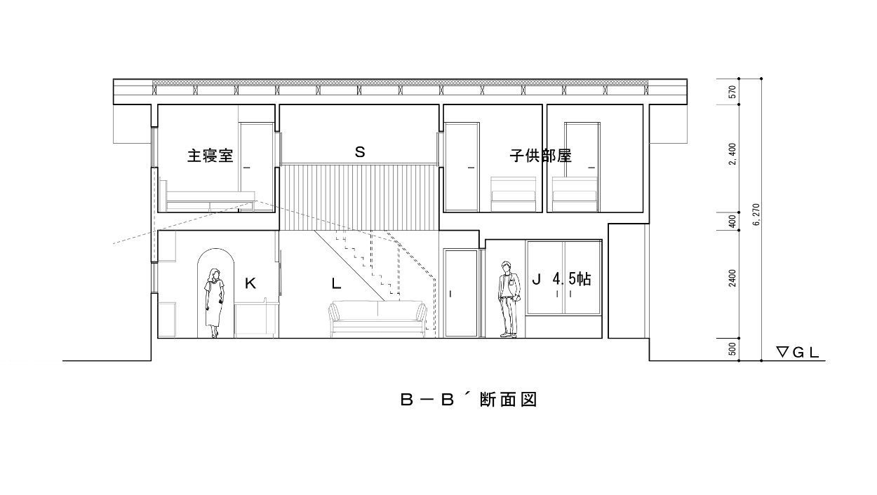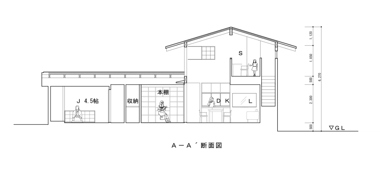 郊外型の4人家族を想定した住宅の提案で、延床面積を40坪以下で計画。子どもが独立した後のことを考えてコンパクトな家を目指した。またL型の平面はウチとソトの繋がりを意識し、どの居室からでも庭を眺められるようにした。