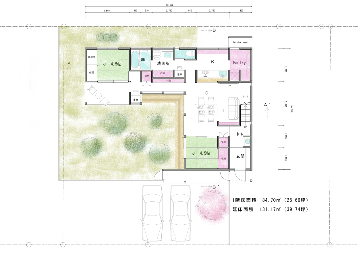 庭にはサクラ・ヒメシャラ・ハナミズキなどを植える計画とした。