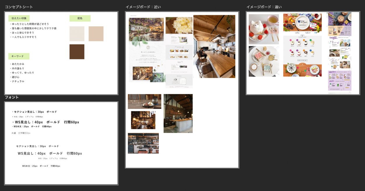 要件定義を設定した後、コンセプトシート、イメージボードを作成しデザインの方向性を決定致しました。