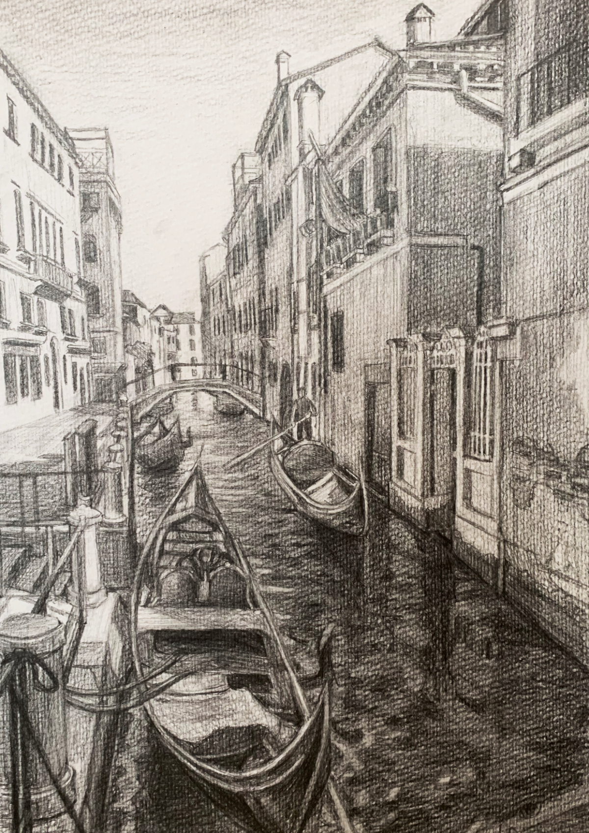 とある外国の風景を描きました。特徴は街中の中にある川道と少し建物が歪んでいるところです。