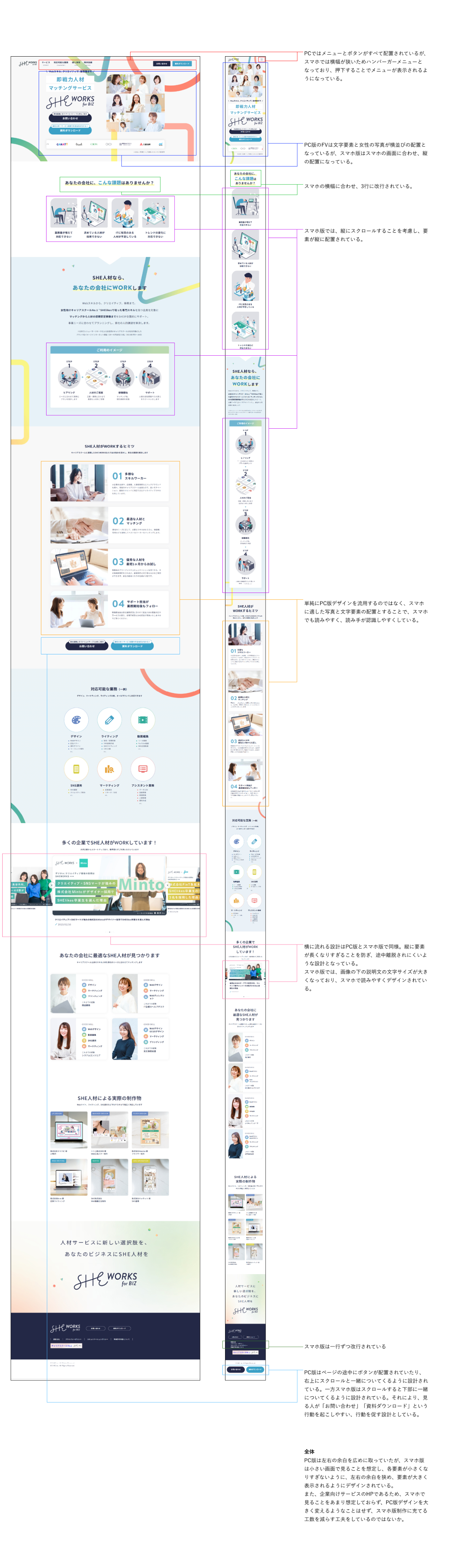 SHElikes PROデザイナーコース3回目の実践課題。Webサイトデザインにおけるビジュアルデザインの感覚を養い、さらにスタイルガイドを作成することで一定のルールに則ってデザインをすることを学びました。また、PC版サイトとSP版サイトのレイアウトの違いを分析しました。