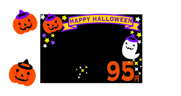 ハロウィンコーナーのデザインです。イラストや周りの装飾物はは自分で作成しました。現在でもイラストや装飾物は使われてます。