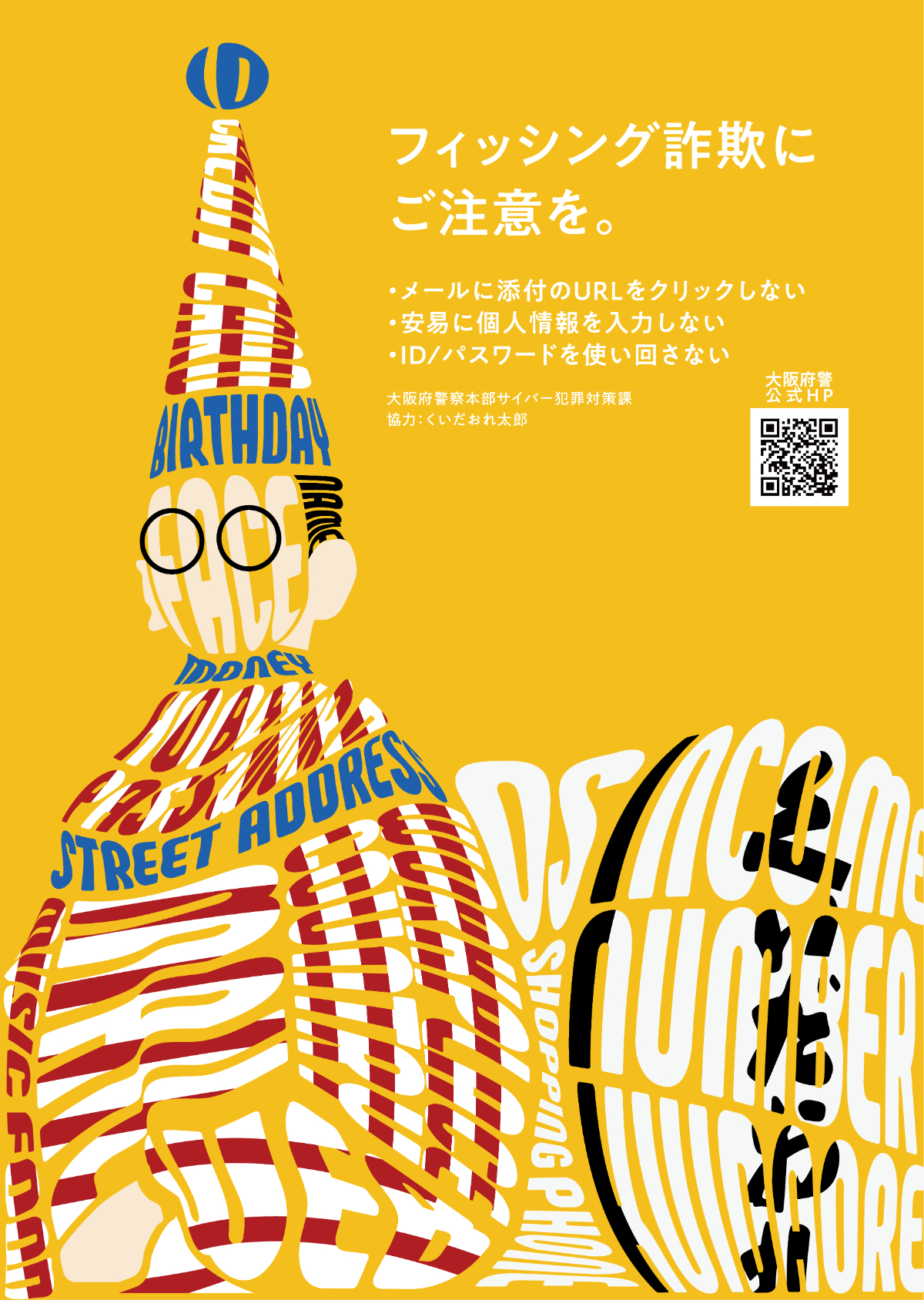 サイバー犯罪防止ポスター Ryo Izuchi フリーランス / グラフィックデザイナー OVERVIEW Client:大阪府警察サイバー犯罪対策課 Content:ポスターデザイン/ディレクション YEAR 2021