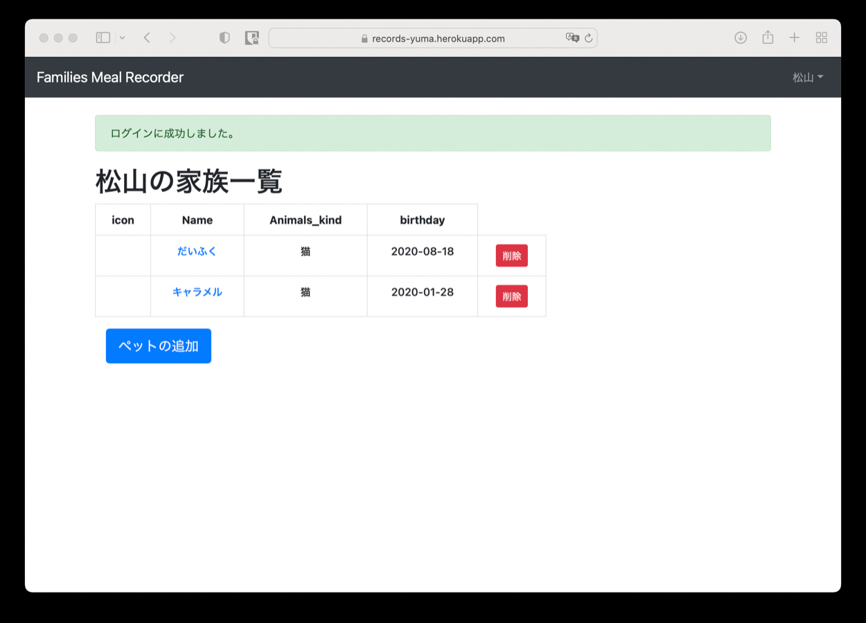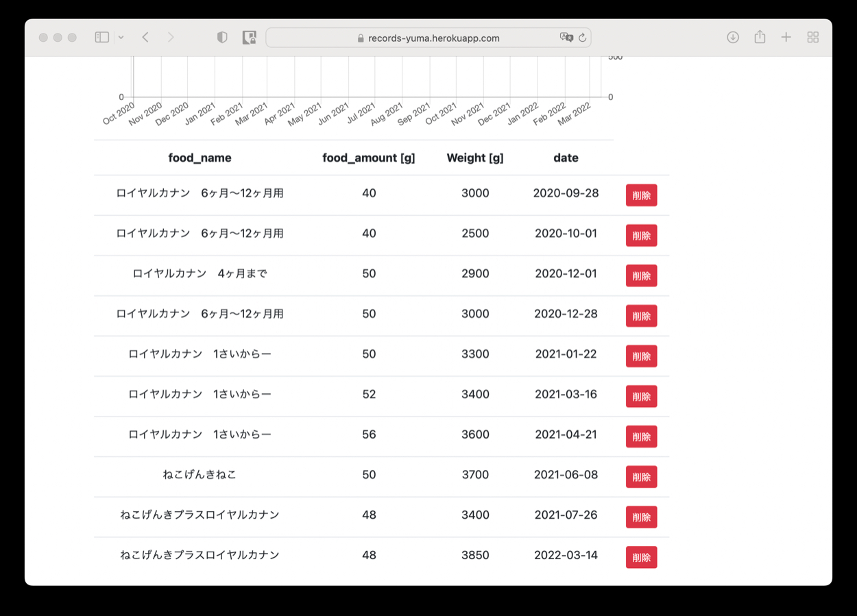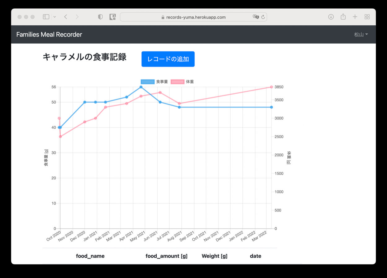 愛猫の食事量と体重記録アプリ 松山 OVERVIEW Ruby on Railsを用いて制作したWebアプリケーションです。愛猫の情報を登録し、食事の量が変わった時や体重を測定した際に記録を残すことができます。CRUD、ユーザー登録などの基礎的な考え方を学びました YEAR 2020 - 2020 使用言語:Ruby on Rails, HTML/CSS, MySQL, Heroku WEBSITE