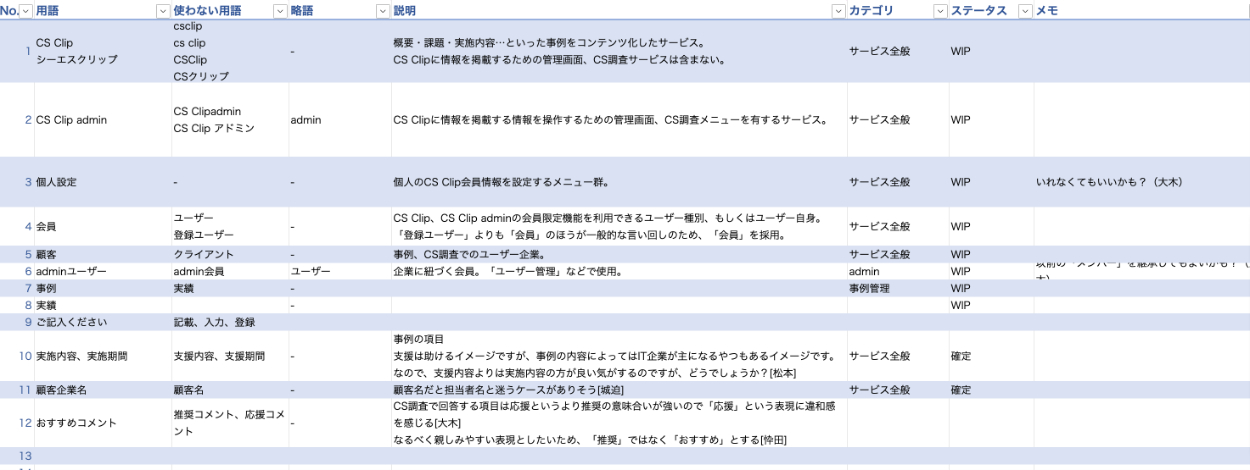 フロー確認後、各画面デザイン改善案を作成する際、用語のゆらぎもあったため合わせて用語を整理し、用語集に定義しました。