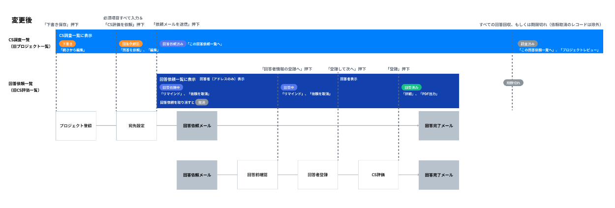 もとからあった機能(CS調査への回答を依頼する機能)に依存関係のある機能(CS調査を実施したいプロジェクトを管理する機能)を後付けした際、機能どうしの関係性が分かりづらいサイト構造となってしまっていた。