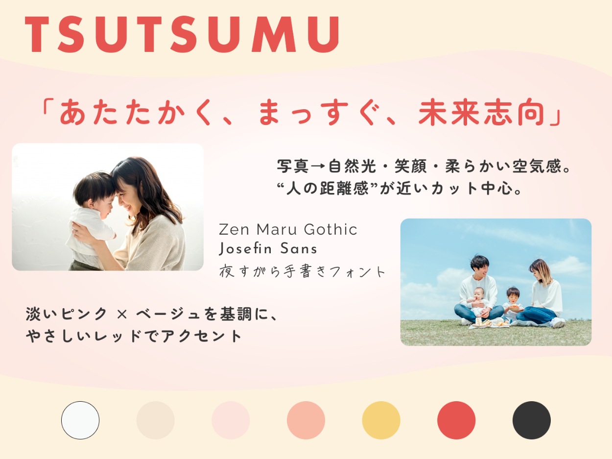 自由提案: 明確なブランド規定がないため、事業内容(家族・幸せ・サポート)に合うトーンを提案する