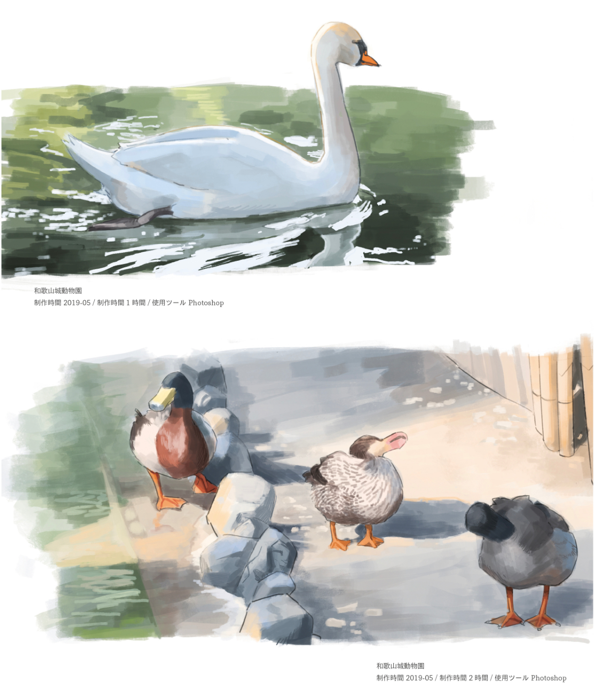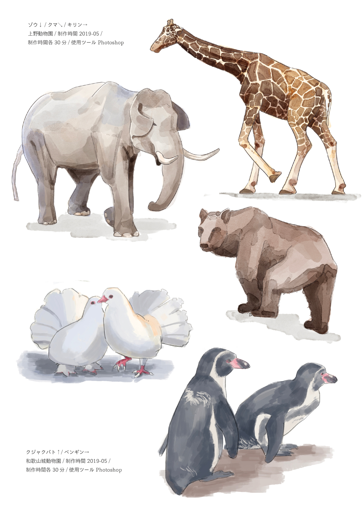 動物スケッチは実際に動物園に通い、そこで感じたことや気になった生き物を中心にスケッチしました。