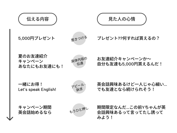 制作にあたり、このバナーを見る人が「どんな状況で」「何を考え」「どう行動するか」というユーザーの行動と感情の流れを想像し、その上で最も効果的にユーザーを行動(紹介キャンペーンへの応募申し込み)へ導くための情報配置を設計。