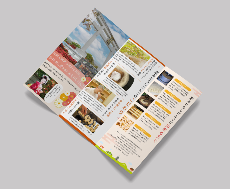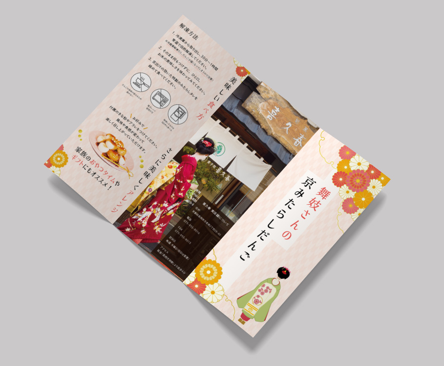新商品の発売に際し、パンフレット作成を行いました。京友禅のような華やかさと舞妓さんの可愛らしさを共存させたデザインイメージをご希望でした。
