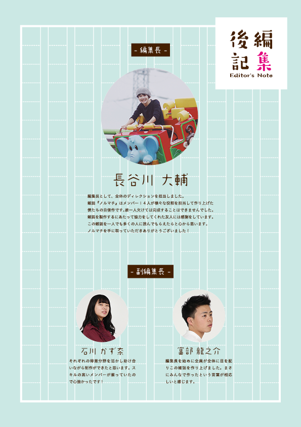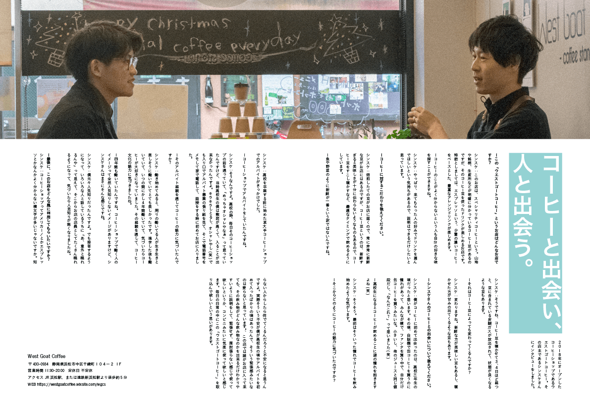私は編集長として全体をまとめるディレクション、表紙レイアウト、ロゴデザイン、カフェインタビュー記事を担当しました。