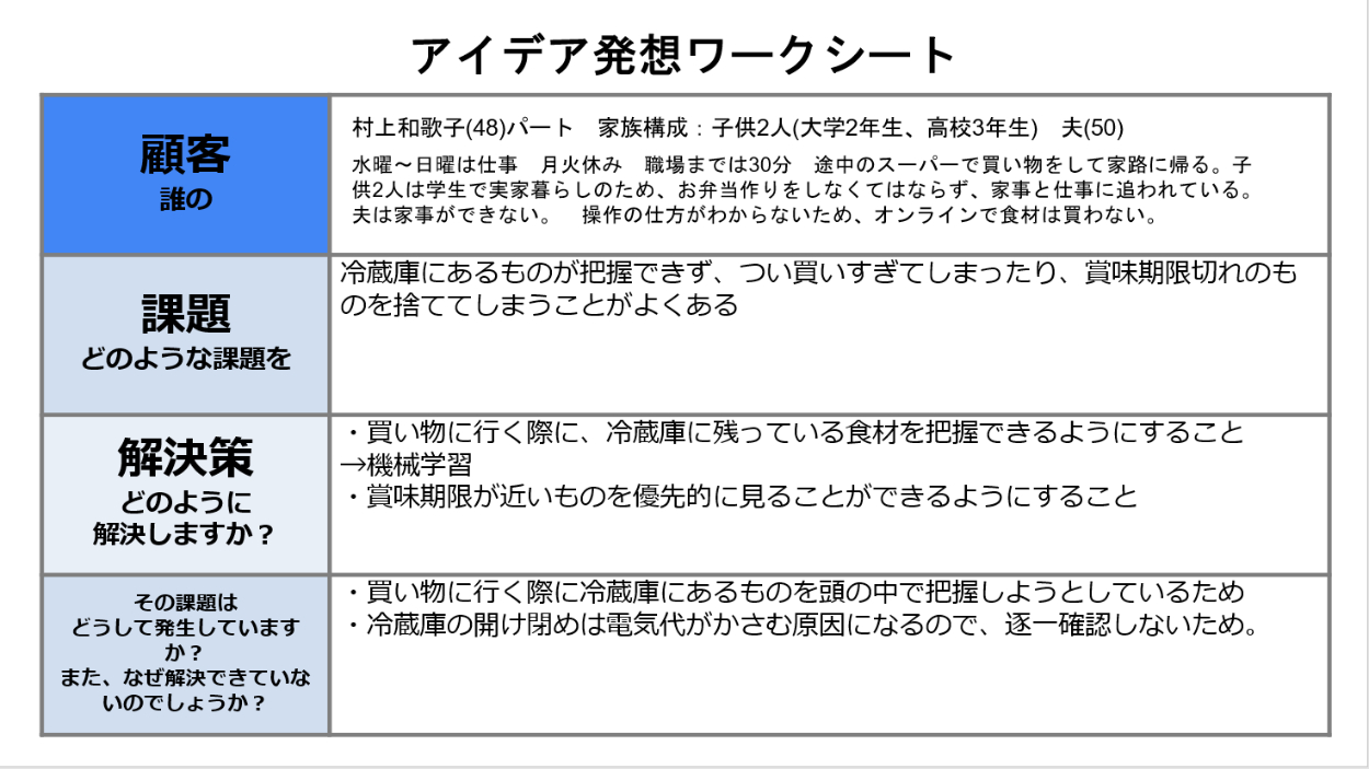 アイデア発想ワークシートに従って構想していったのだが、実際に事業として稼働するときに、何が問題となるのかや収益性、競合との差別化について多くのことを突っ込まれた。