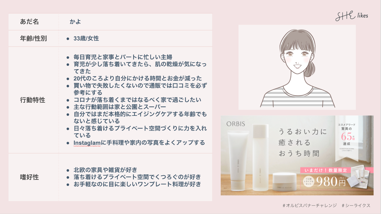 コロナ禍でおうち時間に工夫を凝らすようになったペルソナが通販サイトを使うためにブラウザを開き『オルビスユー』の広告を目にする場面を想定しました。
