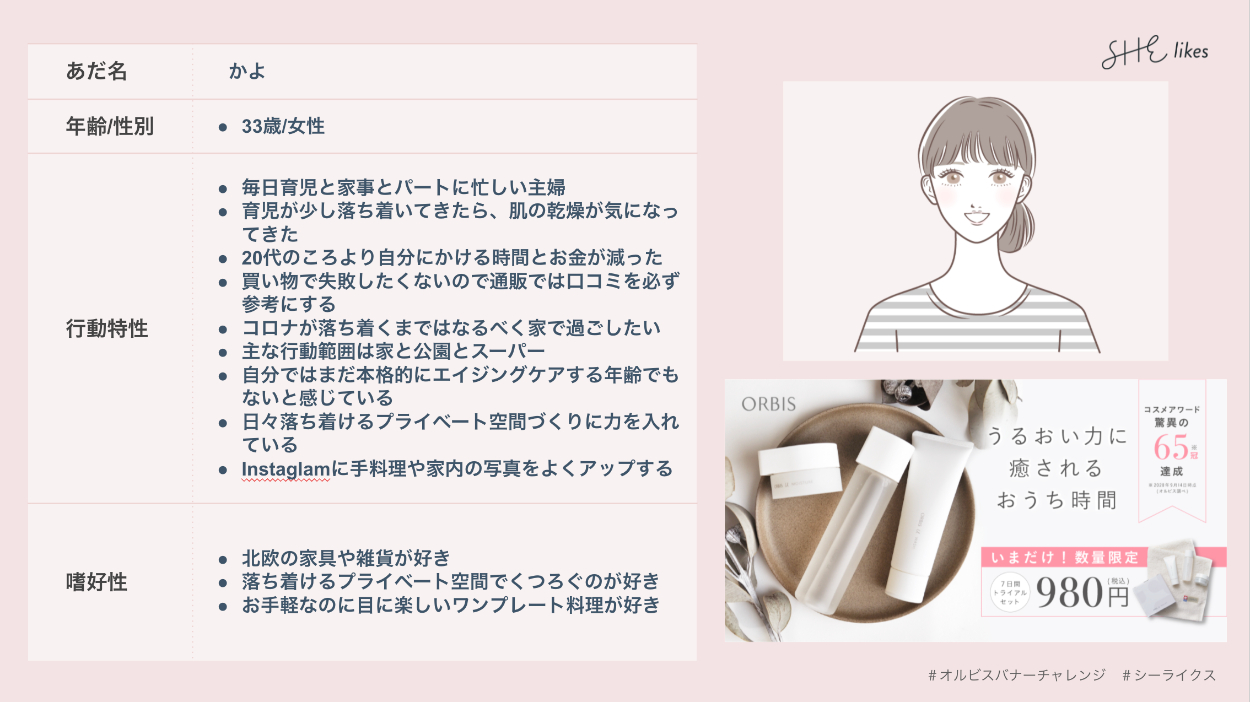 今までORBISの商品を使ったことがない層へ訴求したいということで、実際にORBISを使ったことがないターゲット層に入る自分自身と友人を参考に共通点を洗い出しペルソナを設定しました。