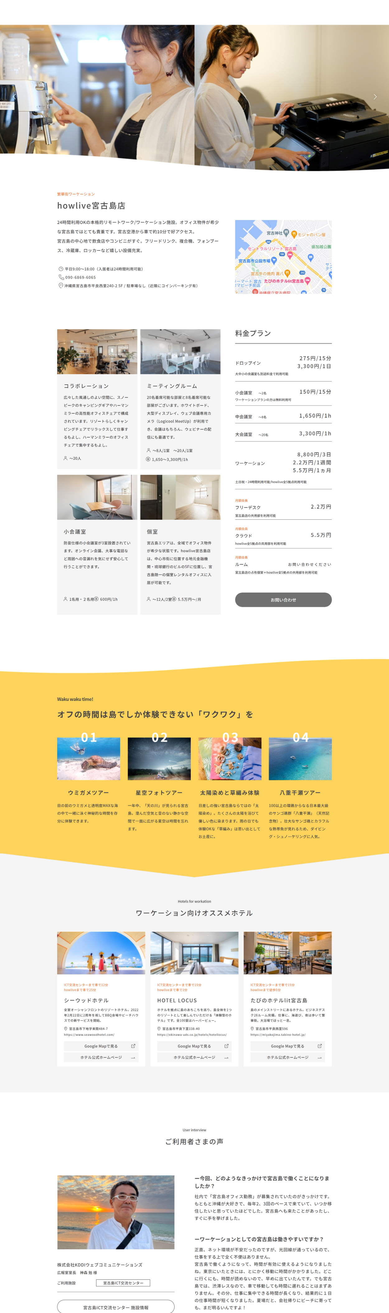 宮古島市から管理・運営を任されているシェアオフィス「宮古島ICT交流センター」、自社直営のシェアオフィス「howlive宮古島」の両店舗の訴求に加え宮古島でのワーケーション情報を伝えるサイトを作成しました。