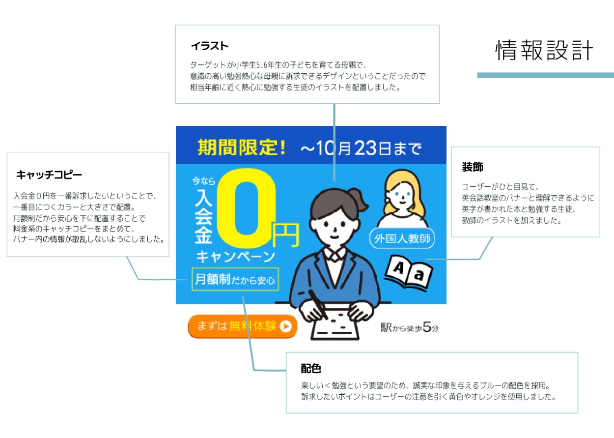 デザインのポイント:小さいサイズで、反映テキストが多いバナーなので、一番訴求したいキャッチコピーの「今なら入会金0円キャンペーン」「期間限定!〜10月23日まで」を目立たせるレイアウトにしました。また、英会話教室のバナーとひと目でユーザーが認識できるように外国人講師と英字が書かれた本のイラストを配置しています。