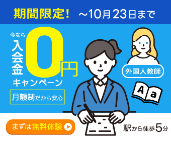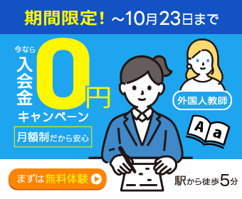 反映テキスト:キャッチコピー「今なら入会金0円キャンペーン」「期間限定!〜10月23日まで(一番伝えたい内容)」、サブキャッチコピー「外国人教師」「月額制だから安心」「駅から徒歩5分」