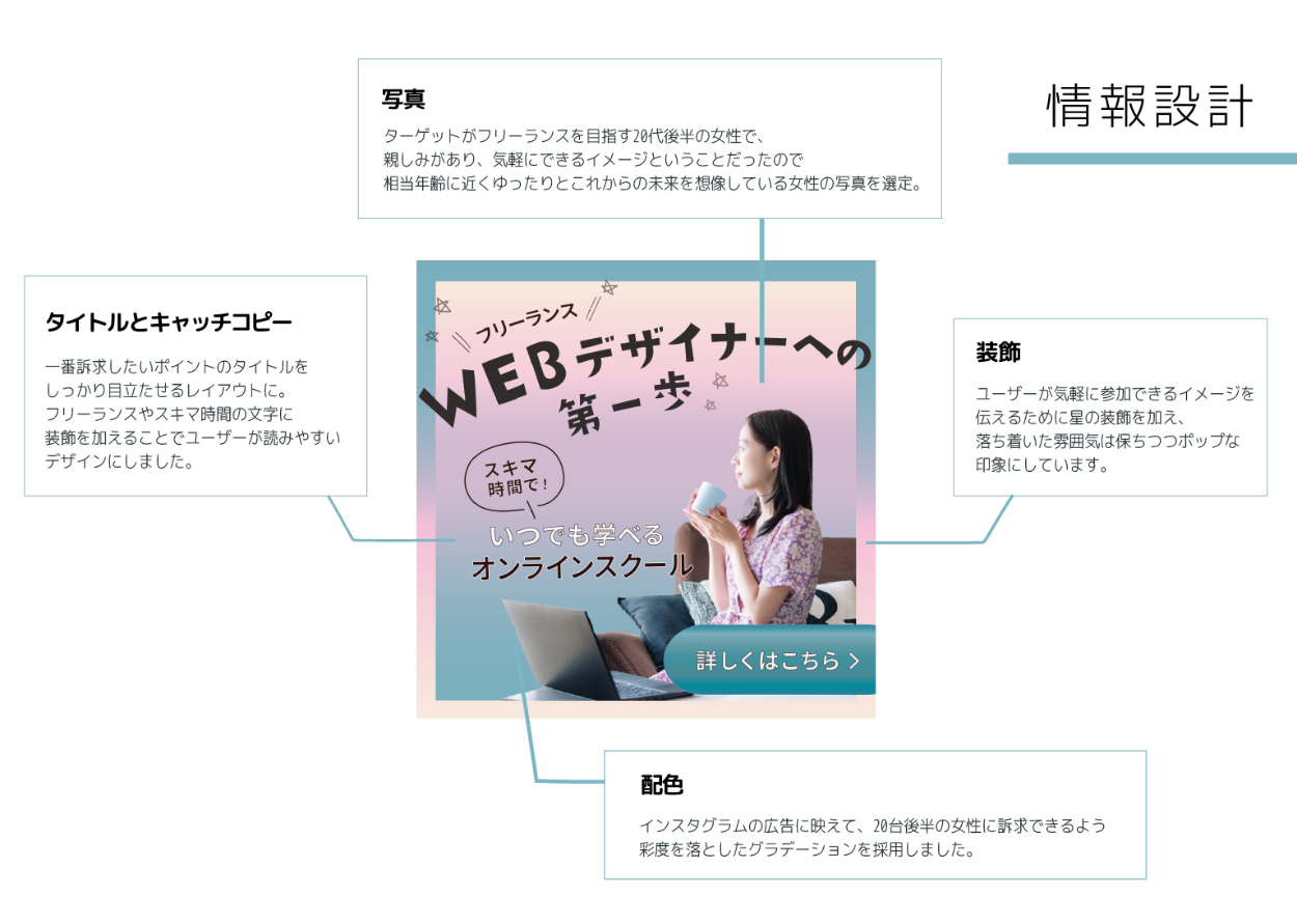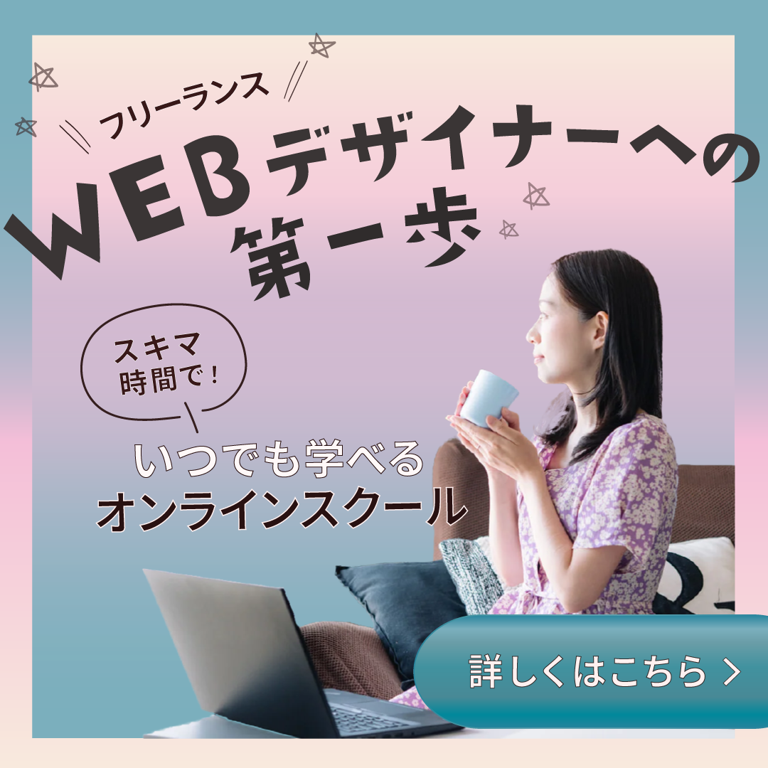 デザインのポイント:親しみがあり、気軽に入会できるWEBデザインスクールのイメージを伝えるためにPOPな字体を使用しました。ターゲットに訴求するために全体的に彩度を落とした落ち着いたカラートーンに設定しています。