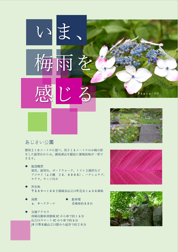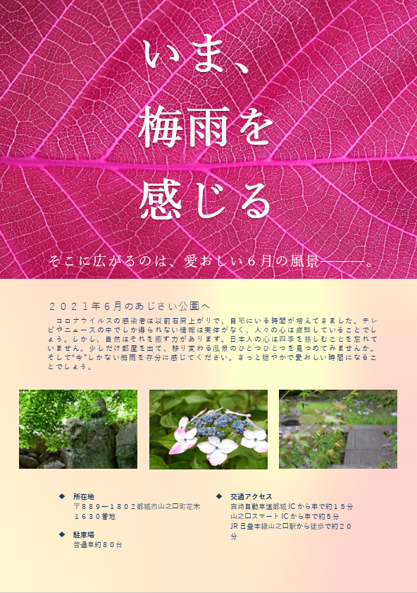 このコロナ禍で外出をひかえる人が多い中、「あえて自然を見に行きませんか?」という提案をする。テレビやニュースの中でしか得られない情報は実体がなく、人々の心は疲弊しているに違いない。自然はそれを癒す力がある。日本人の心は四季を慈しむことを忘れていない。都城やその近くにいる人に、“今”しかない梅雨をあえて感じてほしい。