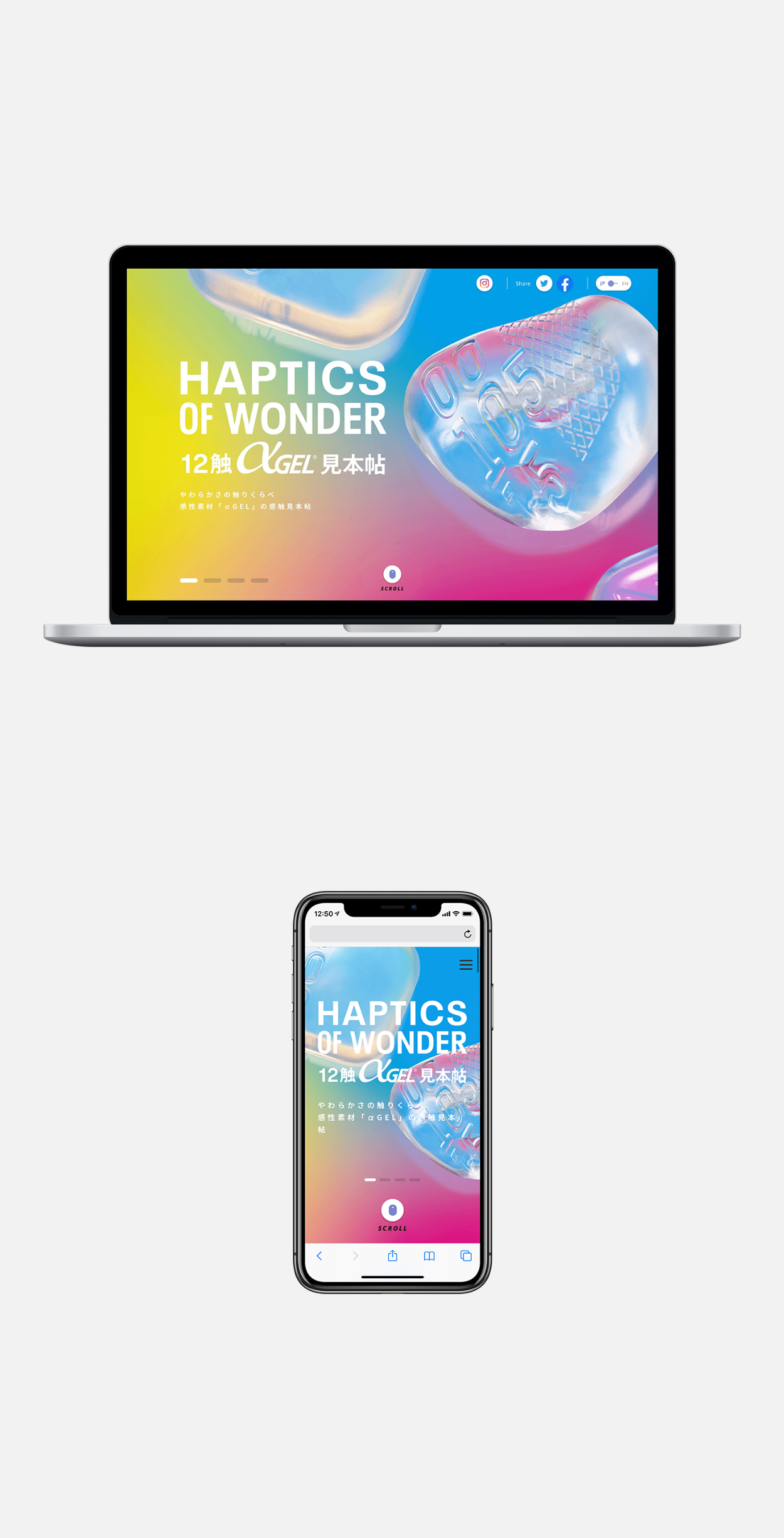 HAPTICS OF WONDER Yusuke Okabe デザイナー OVERVIEW タイカ様の開発するαGEL の見本帳キットを紹介するWebサイトのデザインを担当しました。 YEAR 2019 WEB SITE > WEBSITE
