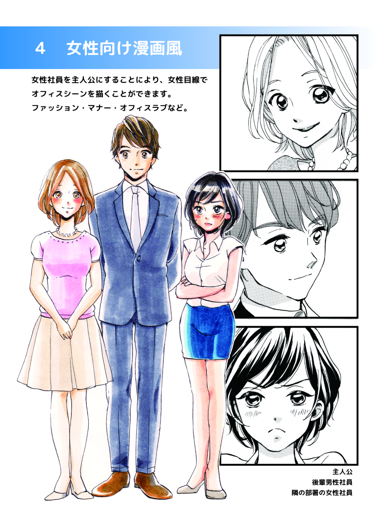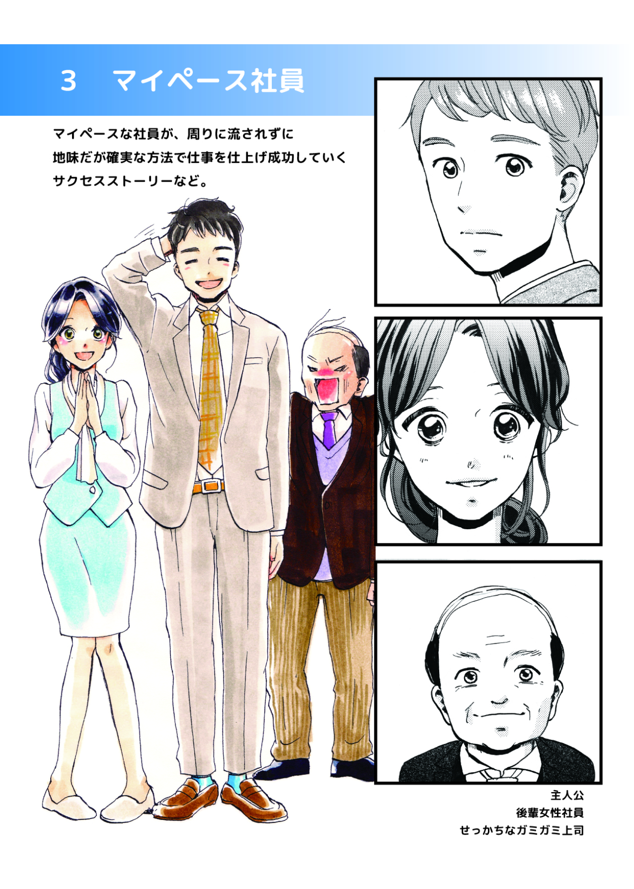 ビジネスシーンのキャラクター K.I.Hayama Natsume 漫画家 OVERVIEW オフィスで働くキャラクターを創作したイラスト集です。 老若男女の描き分けに気を付けながらキャラクターづくりをします。