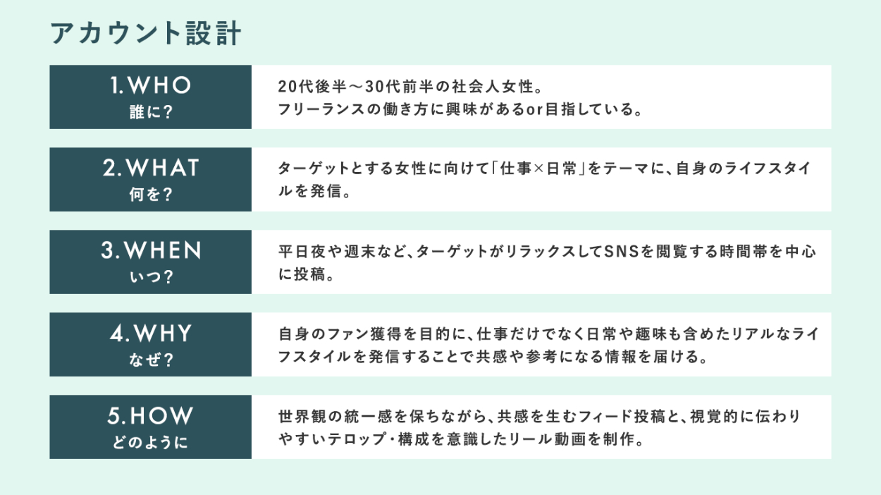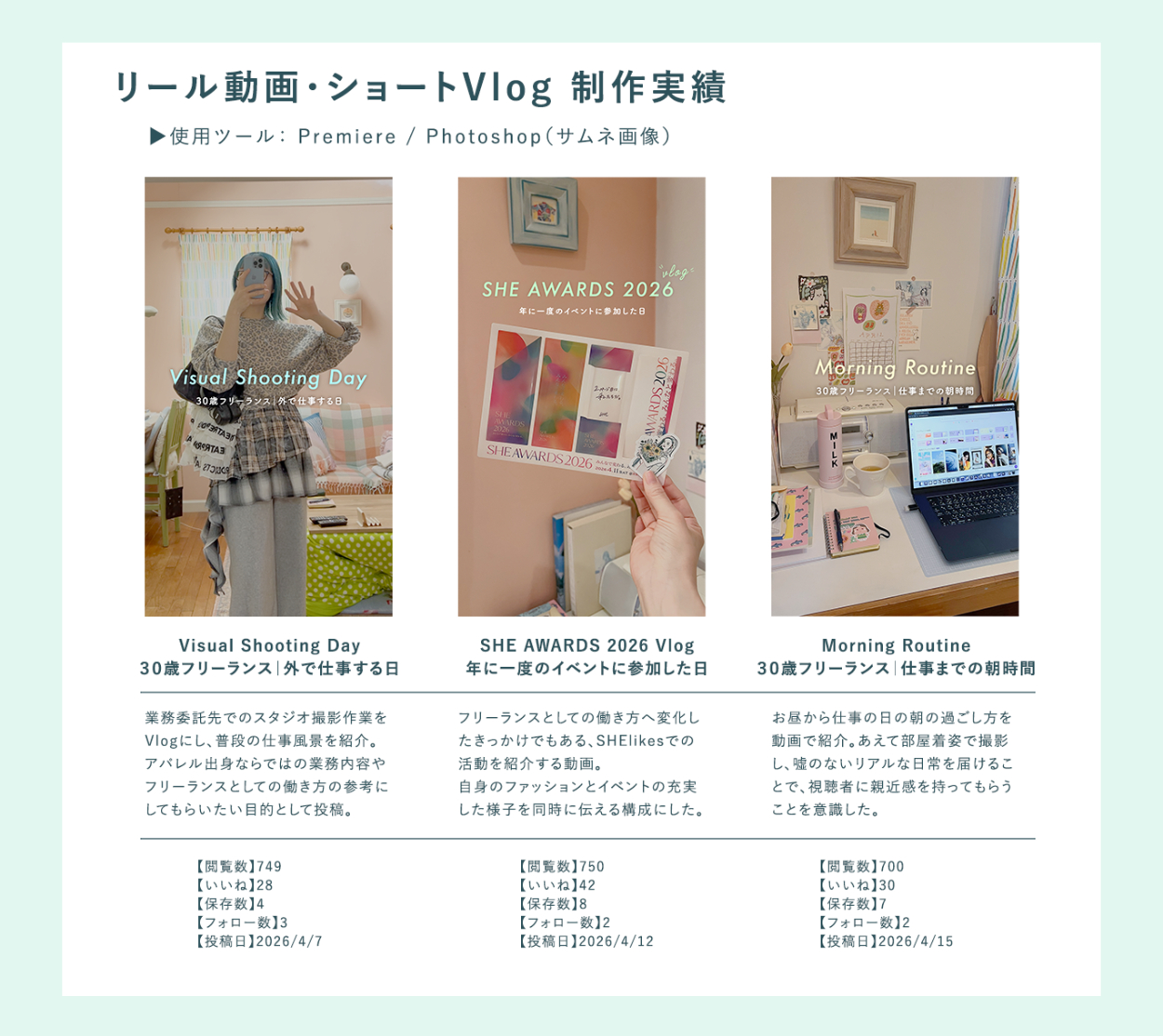 単なる記録ではなく、独自のトーン&マナーに合わせた編集と、ターゲットの共感を呼ぶストーリー設計により、自身のファン獲得を目的として活動しています。