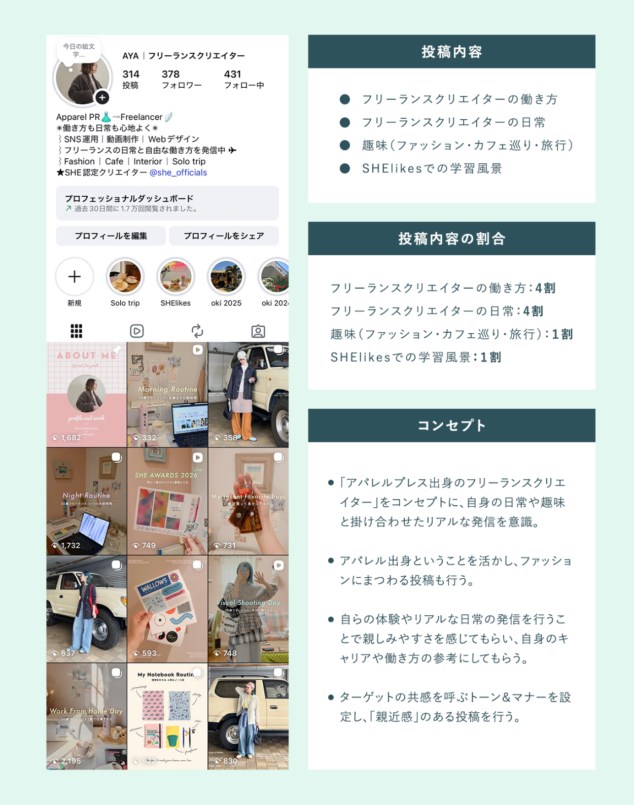 自身のInstagramアカウントにて「仕事×日常」をテーマに、自身と同じ世代の社会人女性へ向けたライフスタイル発信を行っています。