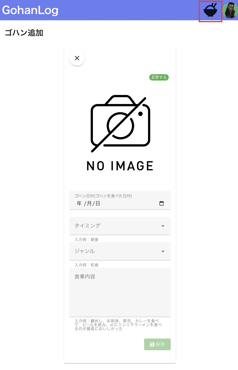 その際は、「図2.ゴハン追加画面」にあるようにヘッダー部のゴハンアイコンをクリックすると、「ゴハン追加」画面に遷移します。