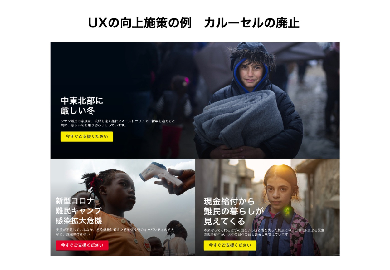 ユーザービリティとコンバージョン率の改善試作の例。トップのカルーセル(横並びのスライドショー)は、2枚目以降の閲覧数が少ないため、カルーセルは廃止しました。