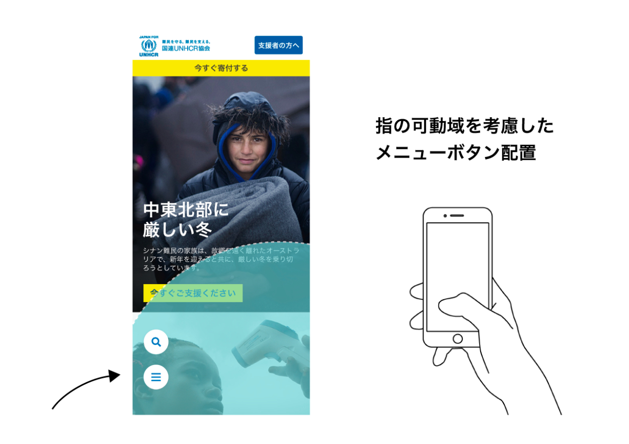 右上に小さく存在したスマホメニューは、指の可動域に入るように左下に配置しました。
