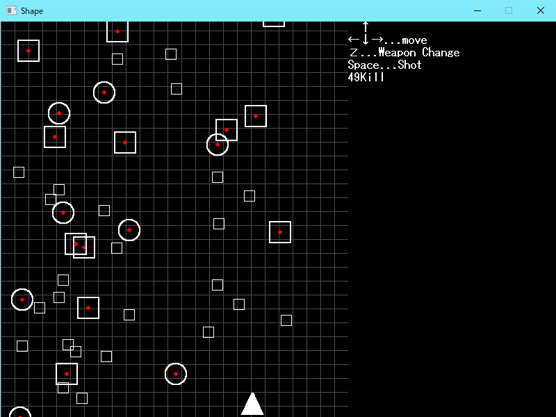 授業で作ってきたものを少し改造しただけのもので、実際に書き加えたものは、敵の種類と弾の種類、他切り替えシステムのみとなっています。