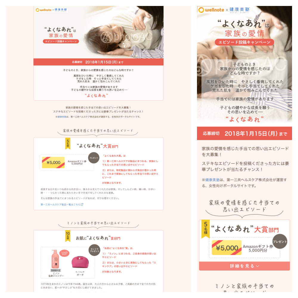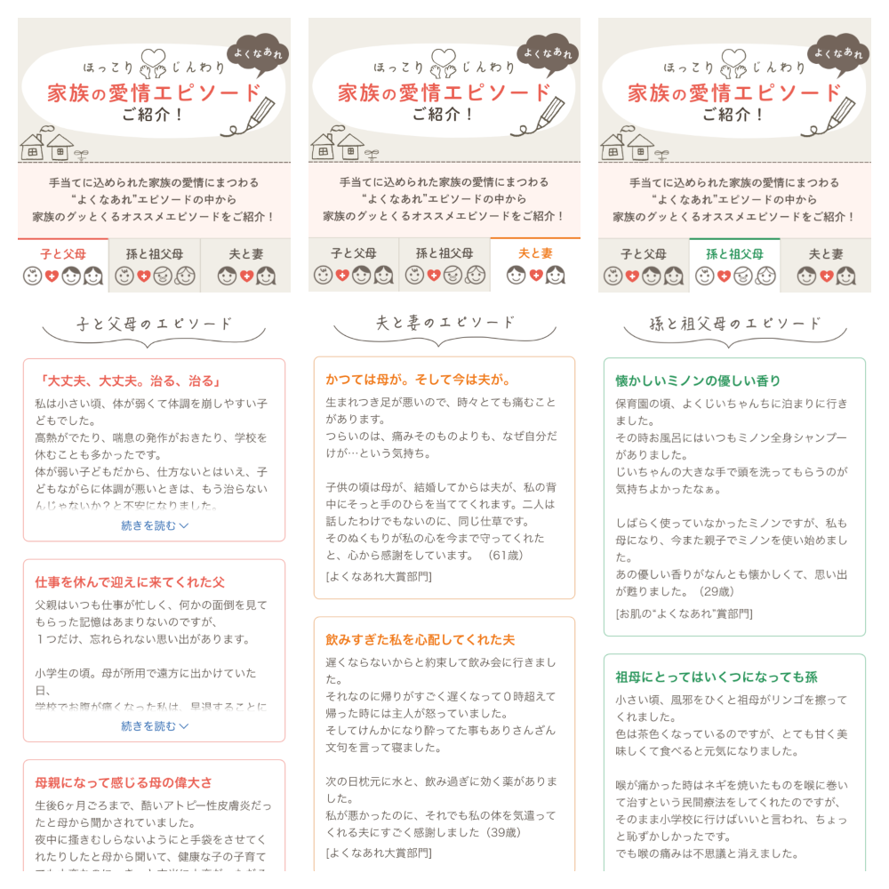 製薬メーカーとのタイアップキャンペーンページで、テーマに沿ったエピソードを募集・結果発表するページを作成した案件です。