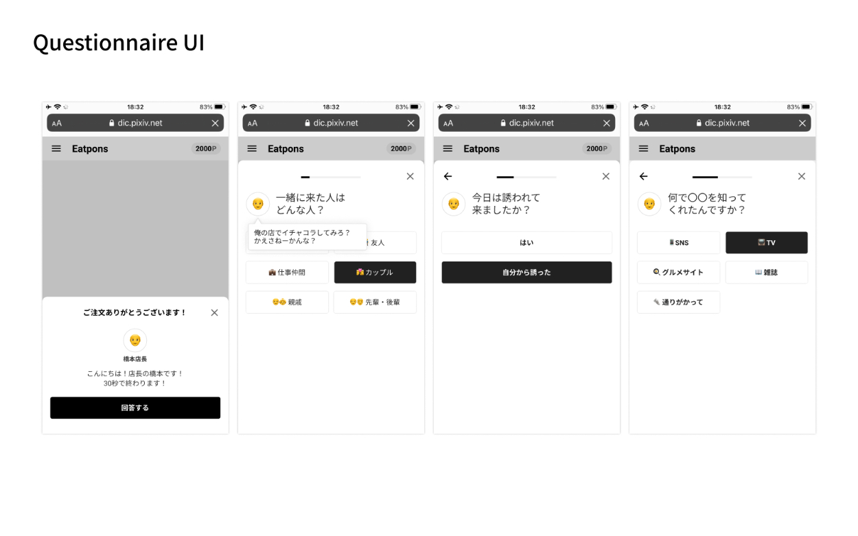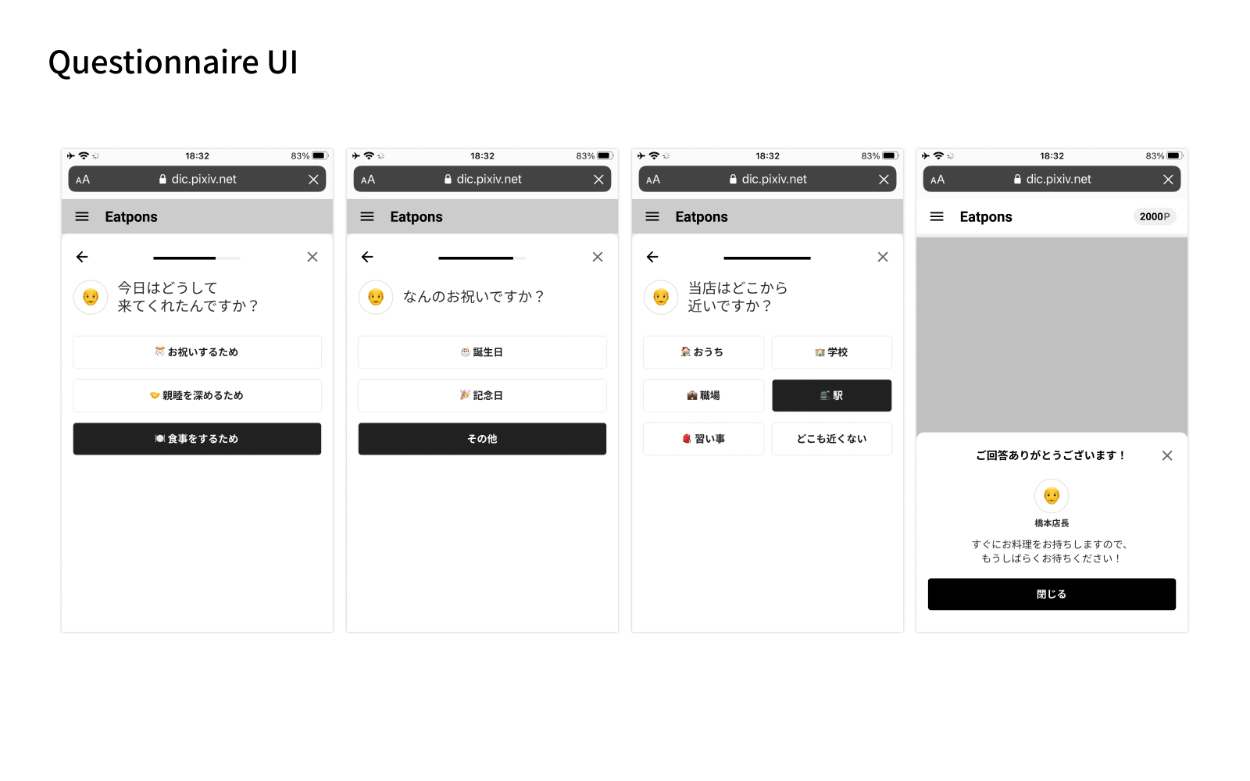 具体的には、ステップ型にし進みやすくすること、そして答える毎に店舗の店長に似せたアバターがコメントを返してくれるインタラクションを設計した。