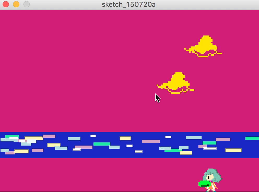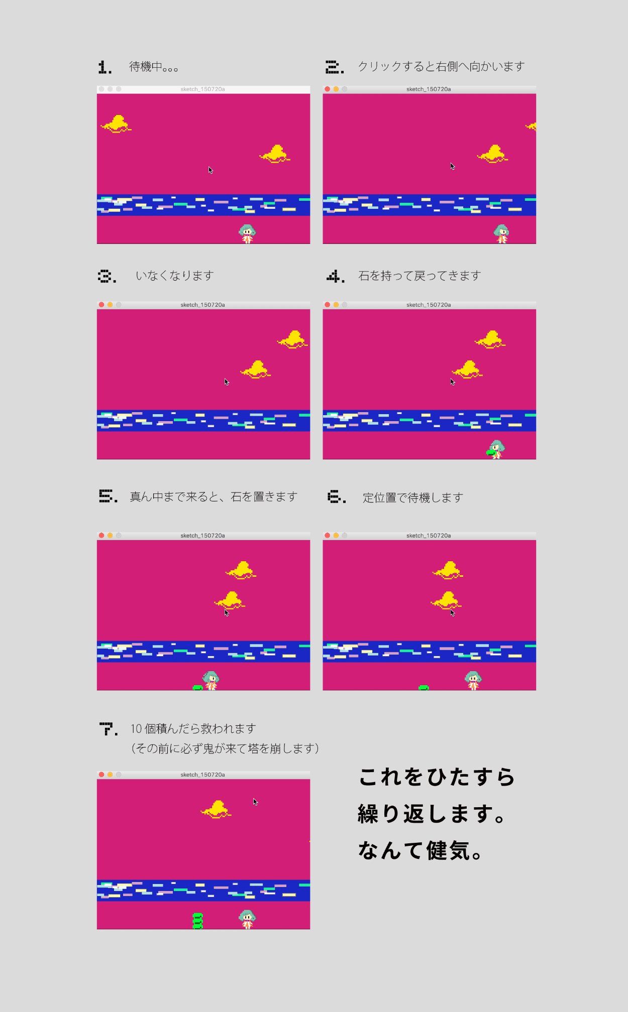 作品形態は自由だったのでProcessingで賽の河原をモチーフに、クリックすると「女の子が石を1個積み上げ、10個石を積み上げたらお釈迦様がやってきて救われるが、 10個積み上げるまでに必ず鬼が来て塔を崩してしまう」というプログラムを作った。