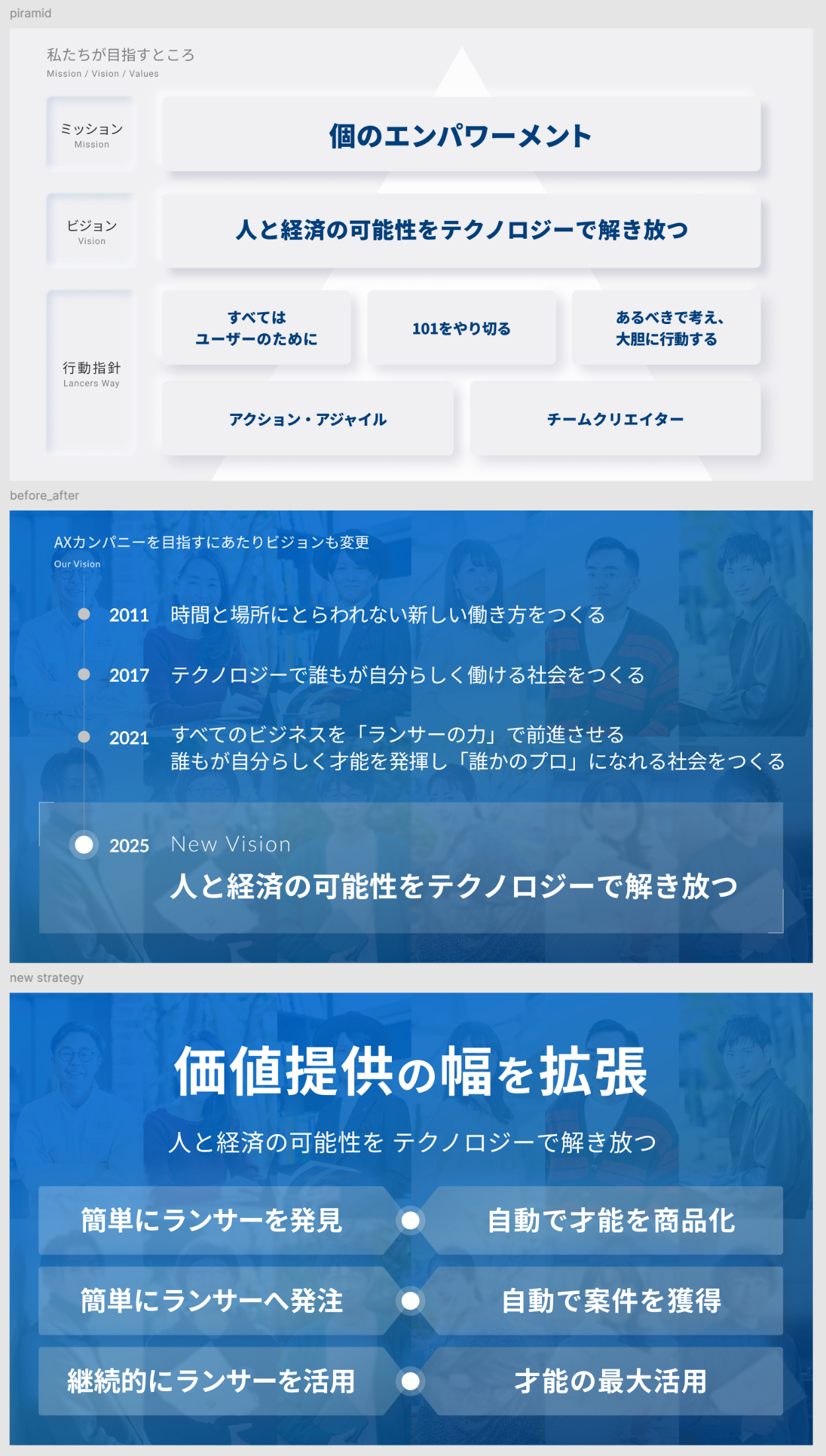 企業ビジョン変更に合わせてサイトリニューアルしたため、ビジョン変更訴求のスライドなども作成しました。