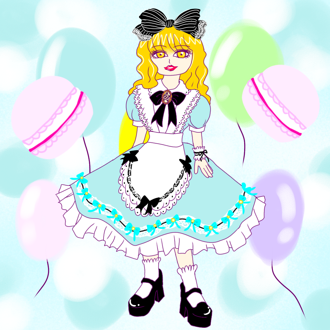 →アリスロリータ風のお洋服に風船や色合いなどで「ふわふわ」を詰め込みました