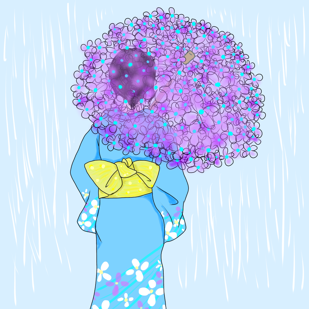 →紫陽花、オリジナルでイメージした紫陽花傘を浴衣姿の女性を描きました