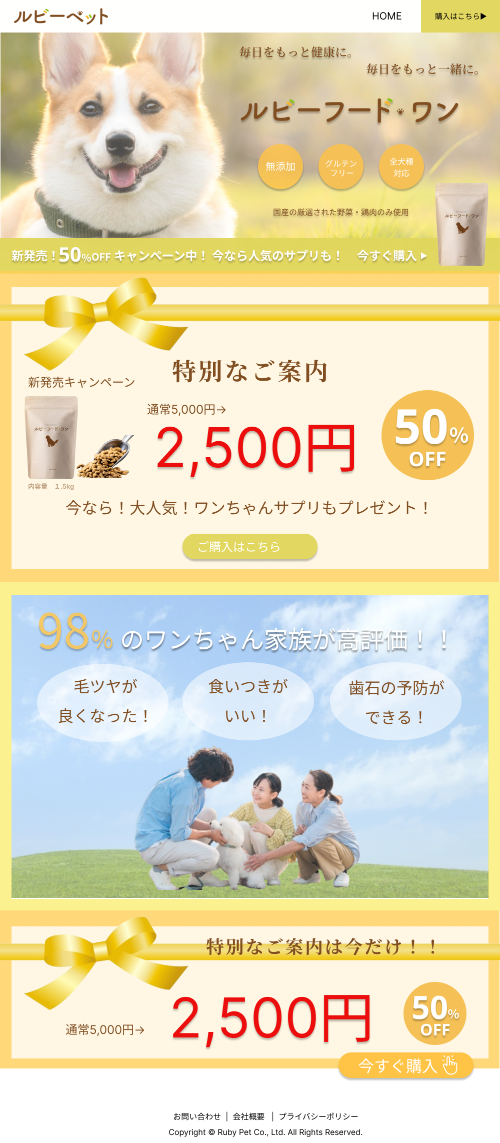 ワンちゃんの健康管理フード「ルビーフード・ワン」を販売開始することになりました。 GDNバナー広告、リスティング広告、弊社公式HP内バナーからLPへ誘導し、購入していただく流れ。 新発売キャンペーンとして初回のみ半額2,500円で販売、サンプルとして当店で人気のワンちゃん用サプリも1つプレゼント。