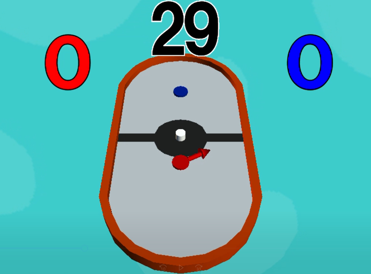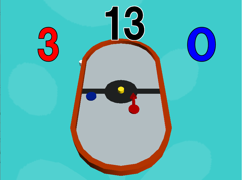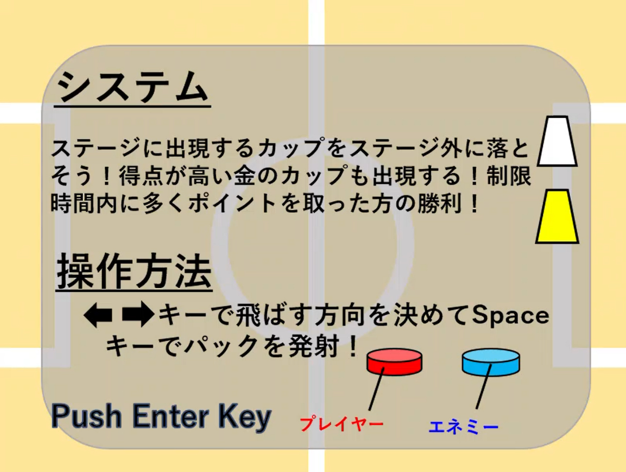 プレイ画面です。赤色のパックを操作して真ん中の白いカップを落とすと得点が入ります。上部の黒い数字は制限時間です。