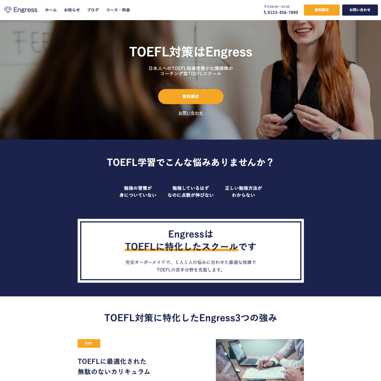 「架空のTOEFL学習スクール」のWebサイトをWordPressを使用して構築しました。