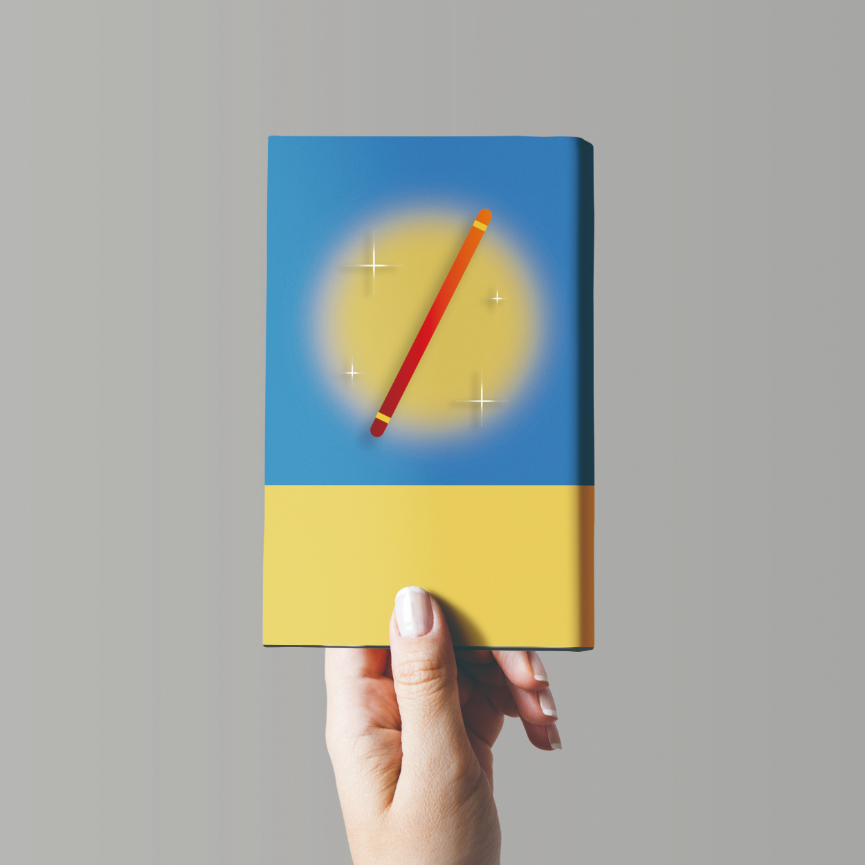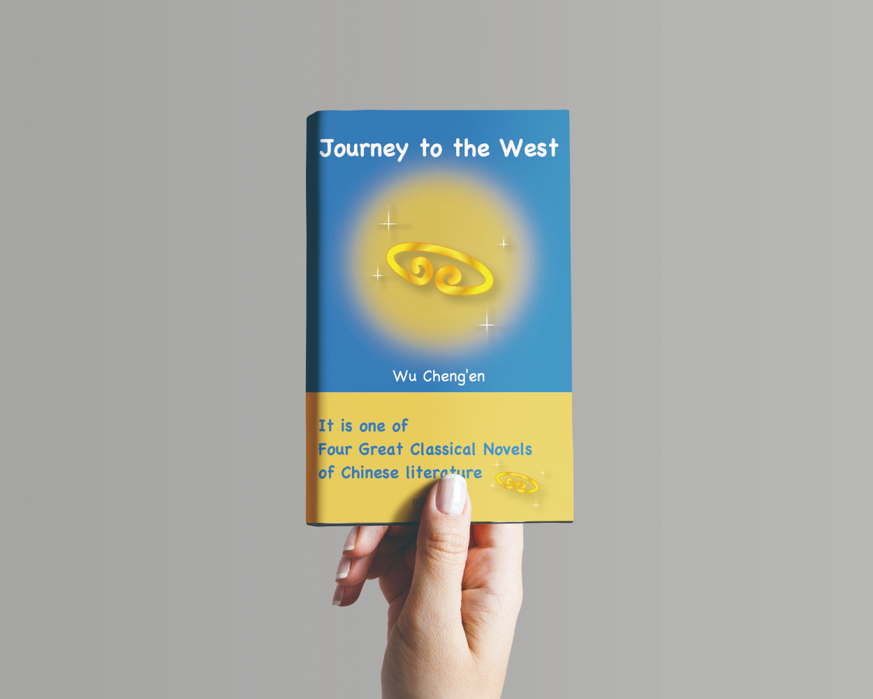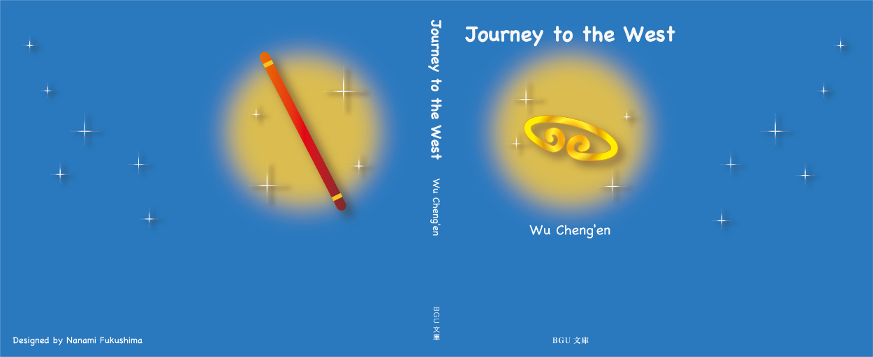 こちらも同じく「西遊記」のイラストを使用した装幀デザインをしました。今回は英語バージョンになっています。文字だけの装幀デザインとはうって変わって今回は子供向けのデザインを意識しました。イラストも物語に出てくるものを作成しました。表紙には悟空の緊箍児(きんこじ)という冠、裏表紙には悟空の武器である如意棒を真ん中に配置しました。グラデーションやドロップシャドウなどを使用して立体感を出しました。英字フォントは丸みのあるものを使用しました。帯にもキャッチコピーのところにワンポイントで緊箍児を配置して、目を引くようにしました。