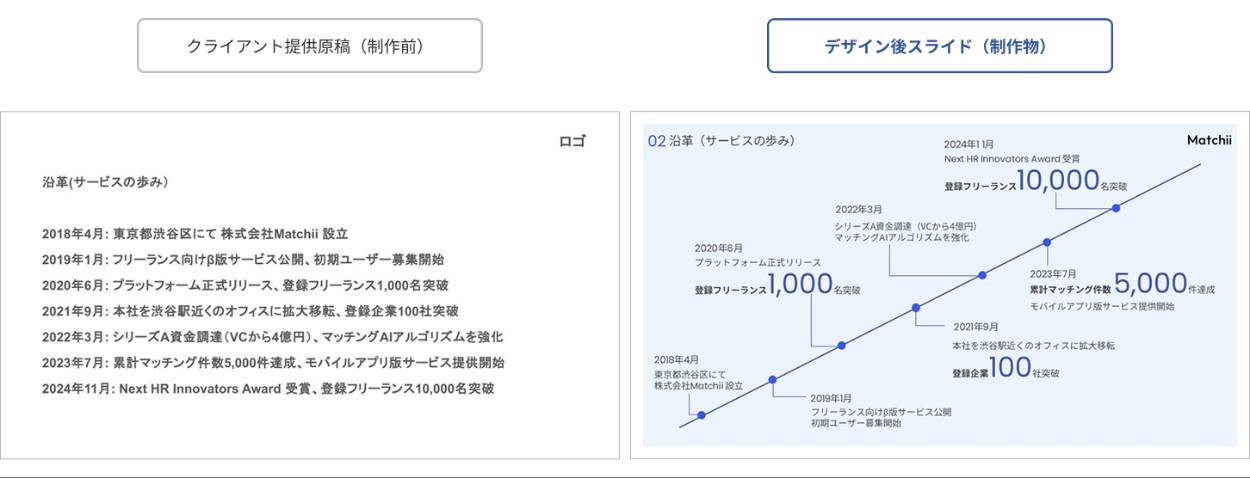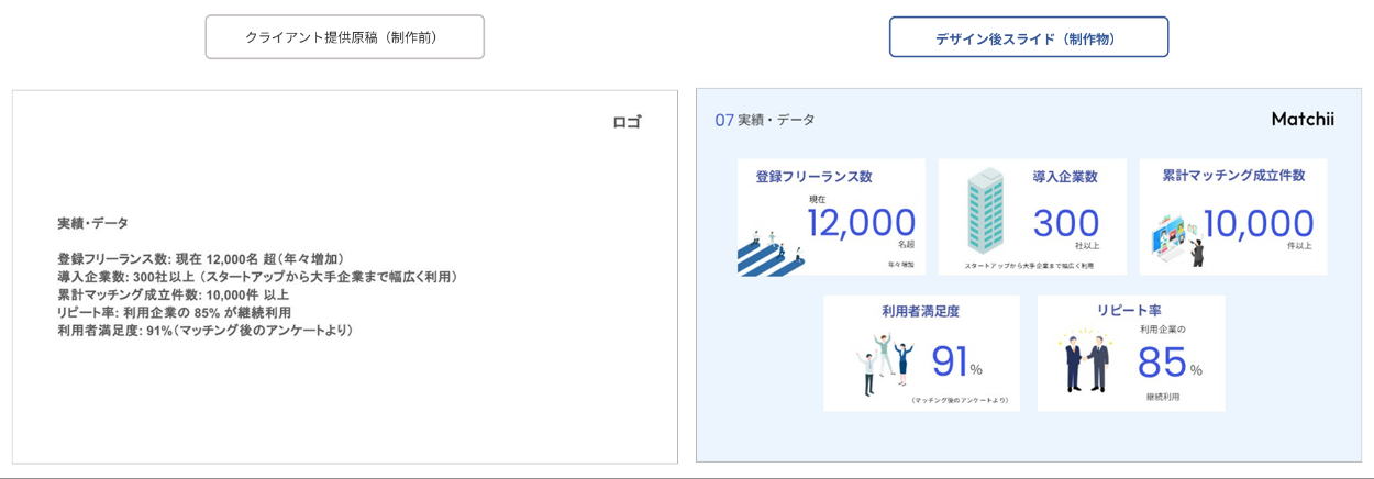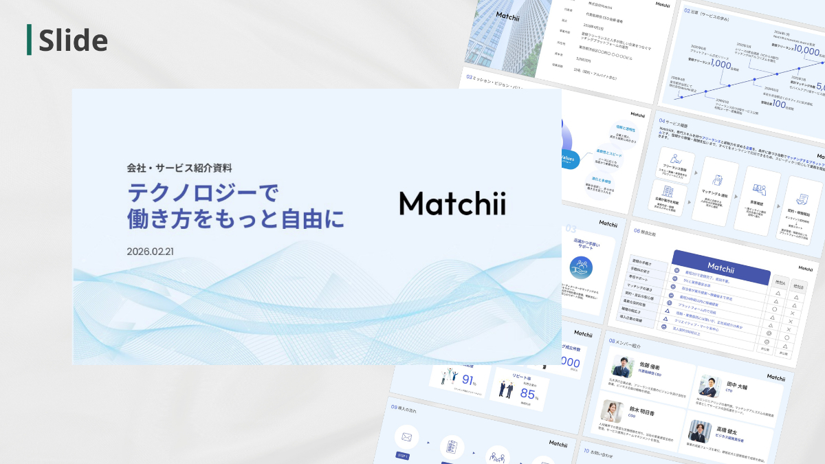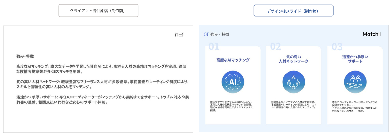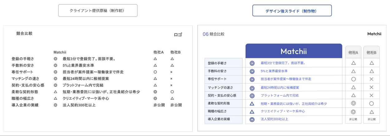 文字量が多いスライドのため余白を十分に確保しつつ、他社との違いが一目で分かるよう、自社(Matchii)の社名を大きく配置し、背景色を用いて誘目性を高めました。